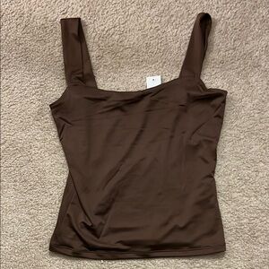 Featuring a square neckline, wide straps, and a square back, this sleeveless top exudes sophistication.