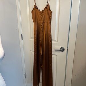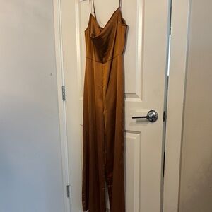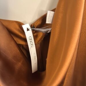 This elegant brown slip dress features a sophisticated cowl neck and thin spaghetti straps, making it perfect for a night out or cocktail event. The smooth fabric drapes beautifully, creating a sleek silhouette that enhances its minimalist aesthetic. With its full-length design and luxurious sheen, this dress is a timeless addition to any wardrobe.stock photos in yellow same dress just different color