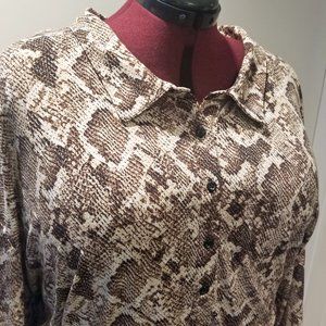Very comfortable calf-length dress WITH POCKETS!! This looks so good with a black jacket and black boots. It does not have the tags on it, but I have been the only owner and I've never worn it; other than to try it on and decide the color washes my fair complexion out. It still has the extra button bag attached to the inseam.