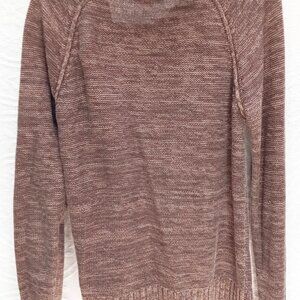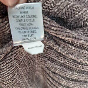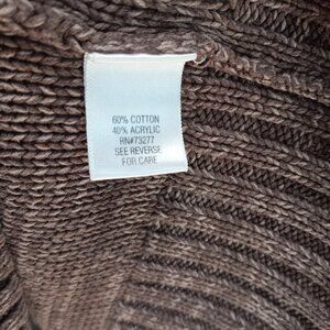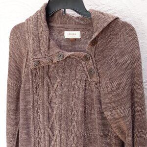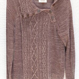 Brown Sonoma Fisherman Style Cable Knit Half Button Wide Fold Collar. Size Large. It is a tweedy-look with two shades of brown. The collar is wide and folds halfway down and there are three buttons. The wrists are cuffed. It is in like new condition.