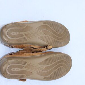 These brown Orthofeet sandals are designed to help with foot pain. They have an adjustable velcro strap for a secure fit.