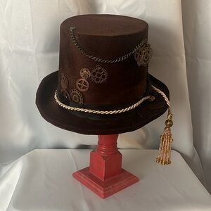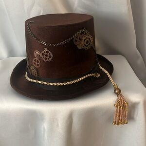 Brown Steampunk Top Hat with gears, chain and tassel.