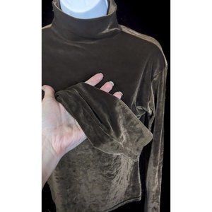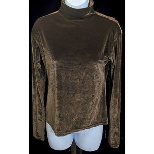 Soft and luxurious brown stretch velvet turtleneck. It's made of a super soft, super stretchy stretch velvet fabric. It has long sleeves, and a turtleneck. The inside of the fabric is smooth, and it's very warm. Super versatile, and great for any occasion!