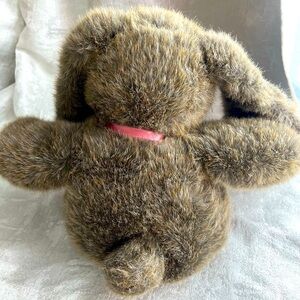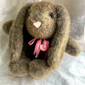 Adorable brown stuffed bunny with a soft pink ribbon, perfect for cuddling and playtime.