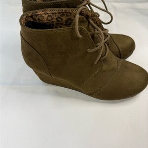 These brown ankle boots feature a soft suede material and a stylish lace-up front, offering a perfect blend of comfort and elegance. The slightly rounded toe and low to medium heel height make them ideal for everyday wear. With a subtle interior lining, these boots add a touch of sophistication to any outfit.