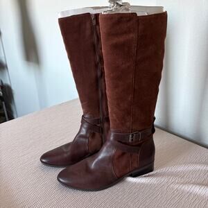 Keywords: brown tall boots, riding style, classic equestrian boot, suede leather mix, wide calf friendly, fall fashion staple, cottagecore boots, Naturalizer comfort.