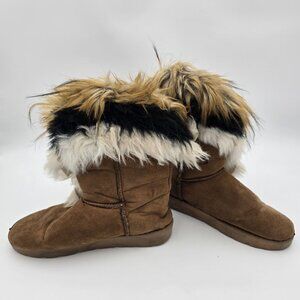 These brown suede winter boots feature a cozy faux fur lining and multicolor, shaggy faux fur trim in brown, white, and black hues. Designed for warmth and style, they offer a durable rubber sole for traction. Pre-owned condition with visible signs of wear, including small stains and scuffs.