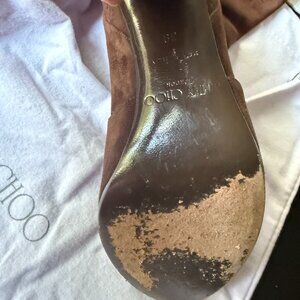 Dark brown suede pull on slough Jimmy Choo booties. Sz 9. 4 inch heel. Small knick in on of the heels, see pic. Otherwise in EXCELLENT condition. I simply cannot walk in shoe this high any longer. Bought new by me from dept store years ago, they are gorgeous.