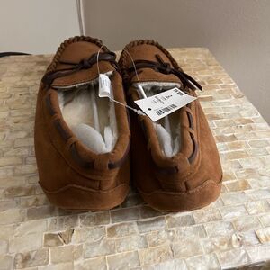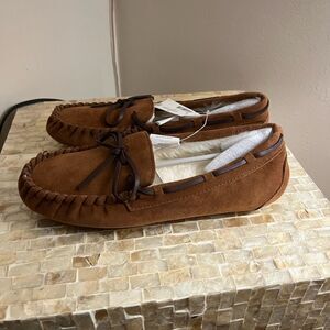 Stylish brown suede moccasins. Features a decorative bow. Comfortable and chic. Size 9 NWT
