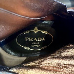Chocolate brown Prada boots for women. Used, mid-calf brown boots, size 8 (Eur 39), with a 4.25" heel. Could use new taps on the heel but still a great shoe.