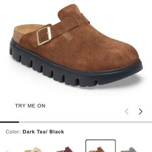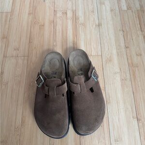 Birkenstock Boston chunky brown suede slip-on clogs with adjustable buckle.