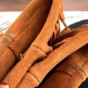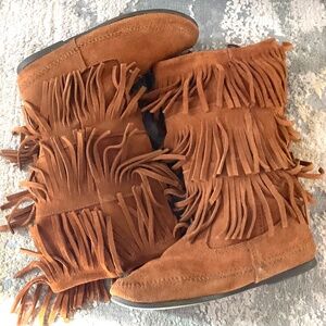 BROWN MINNETONKA SUEDE LEATHER WESTERN BOHO MOCCASIN 3- LAYER FRINGE BOOTS SIZE 9