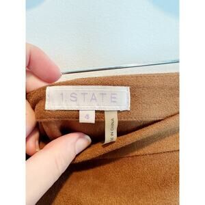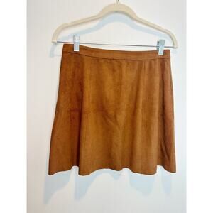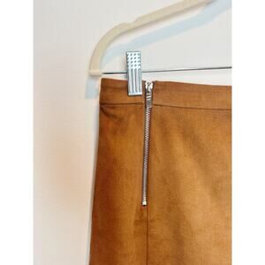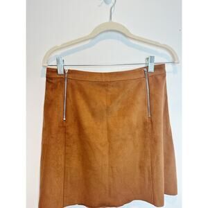 Brown faux suede mini skirt, size 4. Features front zipper details and a raw hem