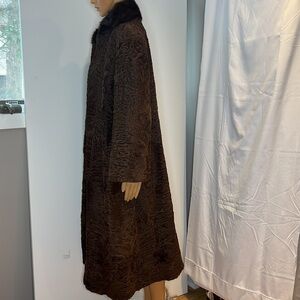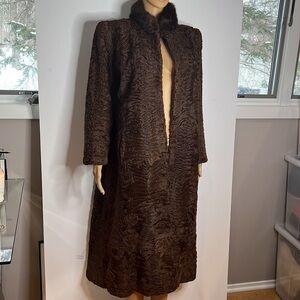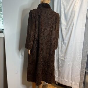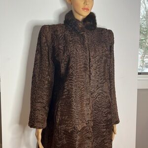 This is a beautiful Brown Astrakhan Persian Lamb Fur Coat. Fits Sz 8-10. Mink collar. Two slip in pockets. Two hook and eye hidden closures. Fully lined. Purchased from a furrier in Lexington KY. No holes. No odors. Personalization can be removed at at tailor. Some very slight rubs at the sleeve edge, but not noticeable.