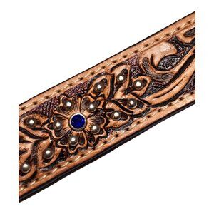 - Color: Brown and Tan flower design with 2 blue rhinestones and silver studs