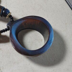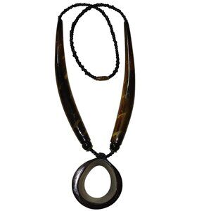 This vintage necklace features an earthy horn pendant with natural patterns and a beaded strand. Its timeless design reflects classic craftsmanship and elegance.