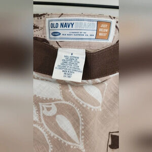 Shell: 55% linen/45% cotton, Lining: 100% cotton, tan with brown and white geometric print, summer 2005, retro, Y2K
