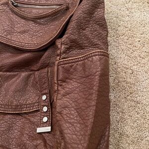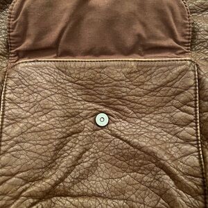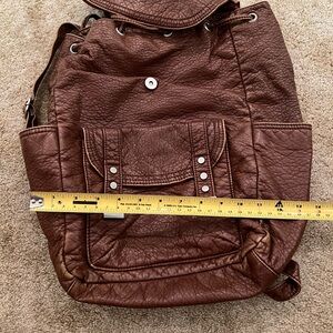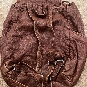 Has main compartment with small zipped inside. Outer has a smaller magnet closure area, flip lid also has zipped pocket, 2 side pockets for water bottles