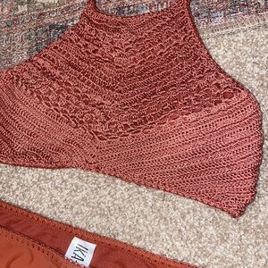 This rust colored bikini set features a sophisticated ribbed texture, offering a modern and minimalist design. The bandeau-style top and matching bottoms provide a comfortable fit with a touch of elegance. Perfect for a stylish day at the beach or poolside lounging. I think I only wore it once or twice, and it no longer fits me.