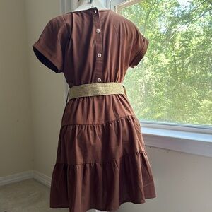 Chic and comfortable brown tiered dress featuring a stylish belt. Perfect for casual outings or a day at the office. Stretchy belt and linen look fabric