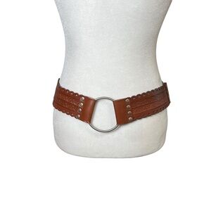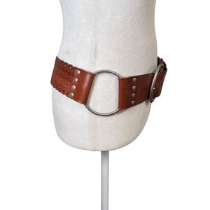 Brown Tooled Leather Wide Statement Belt Rings Boho Waist Festival Women’s Sz S