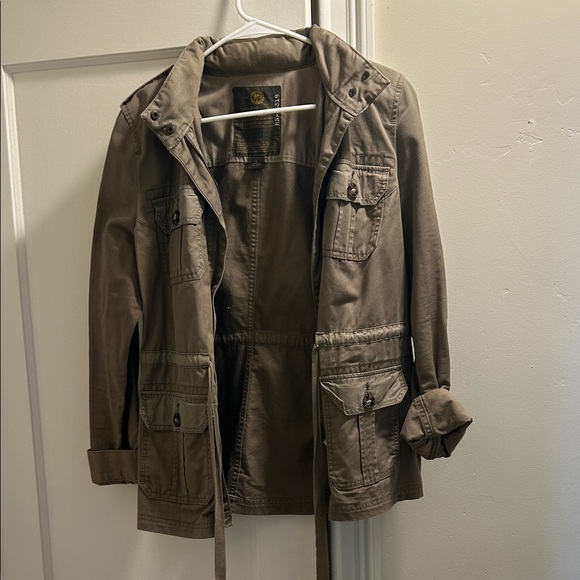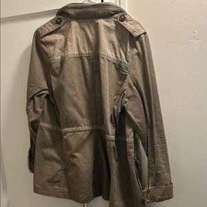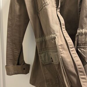 Stylish Vintage 2000s Camo Green utility jacket with multiple pockets. Perfect for casual outings. Has a hood that zips into the collar, can be worn out or not!