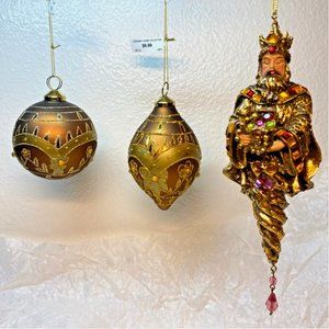 Brown with Gold Decor Glass Ball Teardrop and a King Christmas Ornaments Set of 3. New with tag.