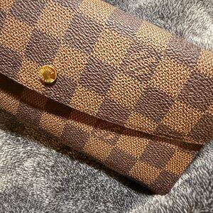 Stylish brown checkered wallet designed for everyday organization. Features a secure gold-tone snap closure and multiple compartments for cards and cash. Elegant brown pattern adds a polished touch to your accessories.