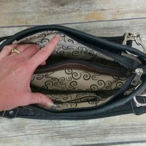Interior includes two open pockets, one zipper pocket, and one center zipper pouch.