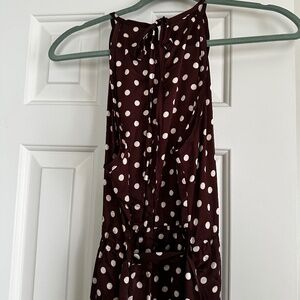 Silky brown with white polkadot Dress — Sleeveless, lightweight, and flattering. The fabric has a soft, elegant drape that moves beautifully, making it great for dinners out, events, or easy everyday style.