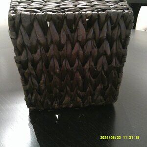 This listing features a brown wicker basket with Nickel handles. The basket can be used as decor, storage, or a wastebasket. The basket measures 13.5 inches tall, 10 inches wide at the widest point, 7inches wide at the smallest width.