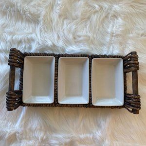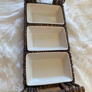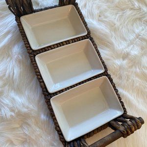 Brown Wicker Woven Condiments Serving Tray w/ 3 Fitted White Dishes NWOT