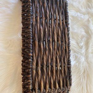 18" wide x 9" tall Brown Wicker Tray w/ 3 fitted white dishes condiments serving tray with handles. All brand new and unused. Each serving dish is white rectangular in shape, 7" tall & 4 1/2" wide. Altogether weight is 4 lbs, 3 ounces. Perfect and any kind of entertaining year-round.