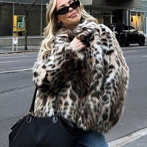 Brown Women's Elegant Leopard Print Faux fur Side Pockets Coat