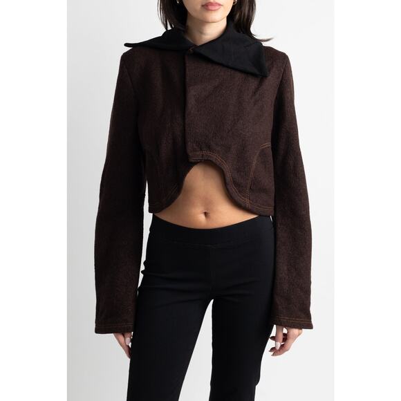 Embrace cozy sophistication with this brown handmade wool cropped cardigan featuring a chic black collar. Sourced in Copenhagen, from brand Sabot, this unique piece blends warmth and style with its finely crafted wool fabric and distinctive design. The cropped fit adds a modern touch, while the contrasting black collar creates a striking visual contrast. A sustainable, versatile addition to any wardrobe, perfect for layering in colder months or styling for a polished look.