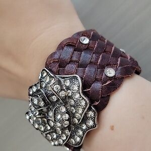 Stylish brown woven cuff featuring a sparkling silver rose buckle. Perfect for adding a touch of elegance to any outfit.