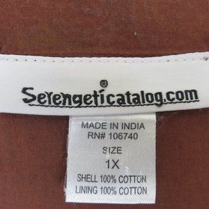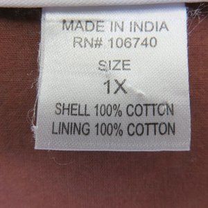Multi colored summer and fall blouse in browns, aquas, teals and golden yellow. The sleeves are three quarter length and the top is lined in plain brown. This top is marked 1X, but doesn't seem that large to me. I don't wear 1X so I may be wrong. Please be sure to read the measurements before purchasing.