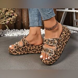 These sandals feature a stylish animal print in shades of brown and black, offering a fashionable yet practical design. With three adjustable straps and a supportive flat sole, they ensure comfort for everyday wear. The slip-on style makes them easy to wear, perfect for casual outings.