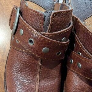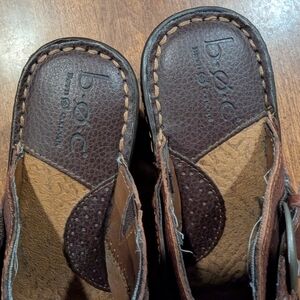 These mules feature a rich brown leather upper with a decorative silver-toned buckle strap, complemented by black rubber soles for durability. The low-cut design and slightly raised heel offer a comfortable fit, perfect for casual outings. The rustic aesthetic is enhanced by lighter-colored stitching and a textured leather finish.