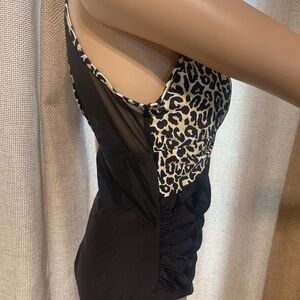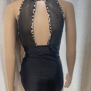 This elegant one-piece swimsuit combines a striking animal print with a solid black design, offering a chic and timeless look. The swimsuit features a classic cut with moderate coverage and a flattering scoop neckline. Made from a slightly shiny, stretchy fabric, it ensures comfort and style for any swim occasion. Built-in support adds to the functionality, making it a perfect choice for both poolside lounging and active swimming. New without tag