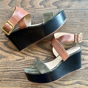 Stylish platform sandals with brown straps and black soles. Perfect for a chic look.