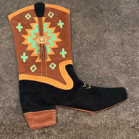 Western boot stocking with brown and black design. Features turquoise and orange embroidery.