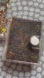 LV canvas upcycled into a notebook bag charm with added gold keychain featuring a cherry charms, pearl and red heart Perfect accessory for bags or keys.