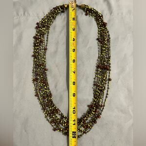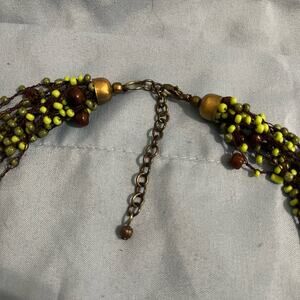 The necklace is adorned with a combination of green and brown beads. The green beads add a vibrant and cheerful touch, while the brown beads provide a warm and earthy tone. The necklace has a lobster clasp to secure it around the neck. The overall appearance of the necklace is elegant and can be a beautiful accessory to enhance any outfit and make a statement.