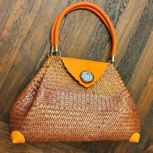 Stylish woven handbag in brown and orange. Features a unique design with a decorative emblem.