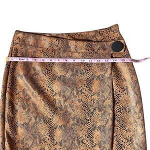 This mini skirt features a stylish wrap design in warm brown and tan tones, perfect for casual outings. The faux snakeskin print adds a touch of texture and dimension, while the asymmetrical hem enhances its modern appeal.