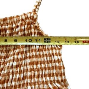 Chic smocked top with a brown and white gingham pattern. Features adjustable straps.