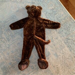 Adorable brown and white kids monkey costume. Zip closure. Features a cute animal design with ears and tail. Soft and comfortable material.