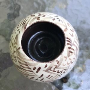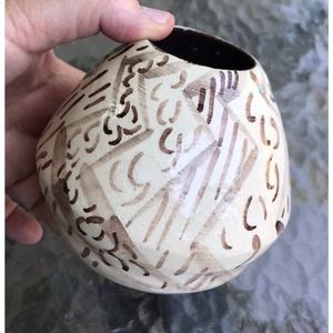 This little pot was created on the Potters Wheel and tapered in at the top with a zig zag pattern.
