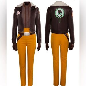 Stylish women's jacket and pants set in brown and yellow. Perfect for a bold, fashionable look.